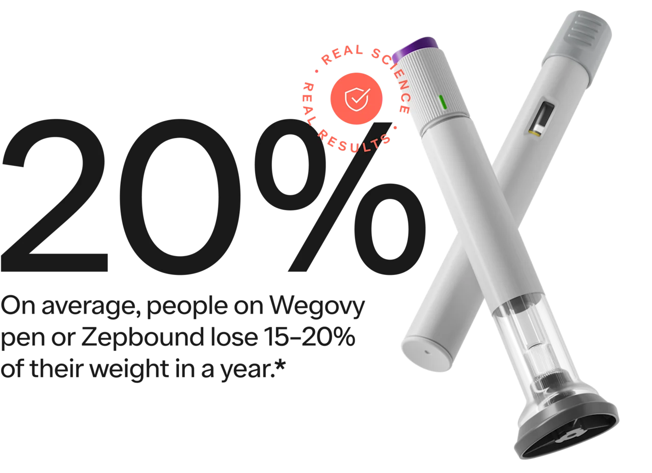 *In separate 68- and 72-week clinical trials studying Wegovy (2.4 mg) and Zepbound (15 mg) in patients without diabetes and with obesity, or overweight with a weight-related condition, the average weight loss was 15% and 20%, when paired with diet and exercise changes (compared to 2.4% and 3.1%, respectively, with diet and exercise alone).