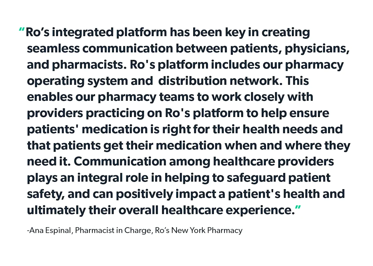 Ro built its own pharmacy operating system and proprietary fulfillment and distribution network to deliver affordable medication to patients nationwide. No other telehealth system integrates a nationwide network of providers with a national pharmacy. This enables providers to seamlessly track a patient’s journey across the Ro platform and facilitates teamwork between physicians and pharmacists to deliver safe and appropriate treatment, from diagnosis to the delivery of medication and ongoing care. Patients using Ro’s platform are also able to have medications fulfilled at a local pharmacy when that option works better for them.This is a mock image for illustrative purposes only and does not reflect an actual patient profile or provider clinical notes.