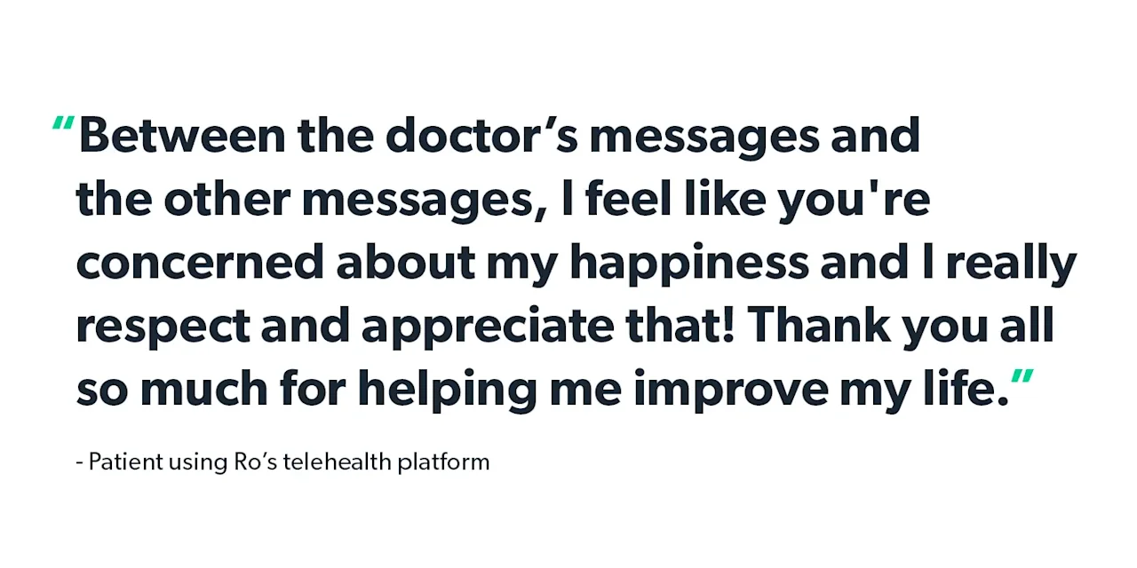 Ro believes that talking to a provider should be easy and affordable for patients and providers. Patients shouldn’t have to wait until an appointment is available, take time off of work, and spend money traveling to and from an office. With direct access to a provider just a message away, Ro removes these barriers and empowers ongoing patient-provider engagement. Patients on Ro’s platform can access and interact with a provider as many times as they want throughout the course of their treatment plan. This is significantly less expensive than paying for multiple in-person visits, even with insurance coverage, and helps keep the patient-provider conversation focused on the patient’s health concerns at that time. Making it easier and more convenient for patients to connect with a provider means they are more likely to do so, which may lead to more regular, continuous care and better health outcomes.