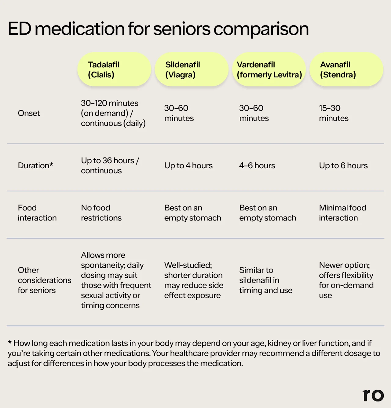 Drugs like Cialis and Viagra can work well, but the best option depends on lifestyle, preferences, and health. Healthcare providers usually start seniors on lower ED drug doses to reduce side effect risks.