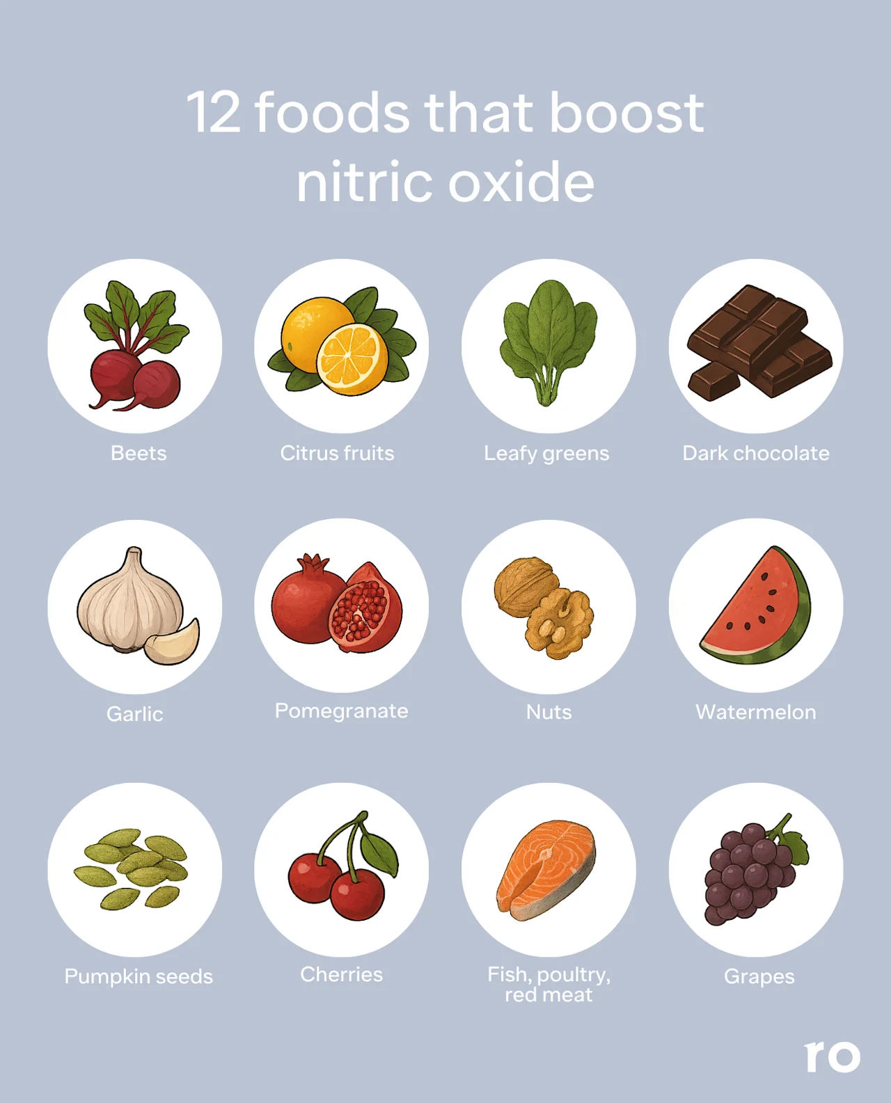 Certain foods can support nitric oxide synthesis. Though you can’t find nitric oxide in food, you can consume foods that help your body make nitric oxide. This includes beets, citrus fruits, leafy vegetables, dark chocolate, garlic, pomegranate, nuts, pumpkin seeds, meat, fish, poultry, Montmorency cherries, and watermelon.