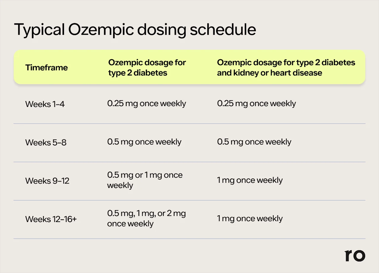 While everyone is different and dosing will be customized to your needs (e.g. additional blood sugar control), the typical Ozempic dosing schedule may look like this: