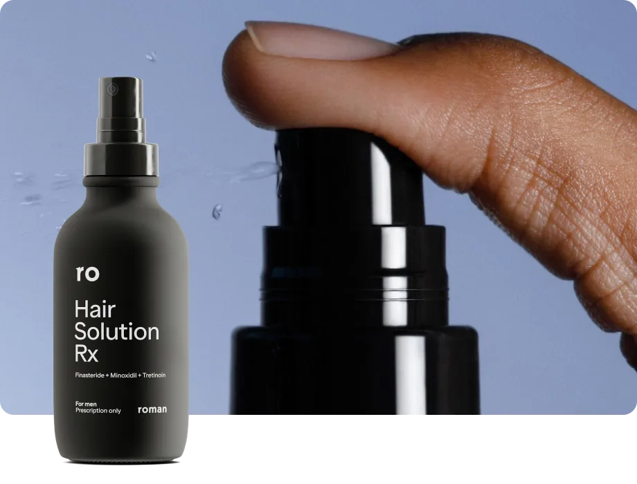 Roman Hair Solution Rx is a compounded prescription medication formulated with finasteride, minoxidil, and tretinoin, applied topically. It is for men only. Children, and women who are pregnant or trying to get pregnant, should not handle this product. The most common side effect is potential irritation where it is applied. Protect your scalp from the sun. Sexual side effects and depression have been reported with oral finasteride. See here for full safety information about each ingredient.