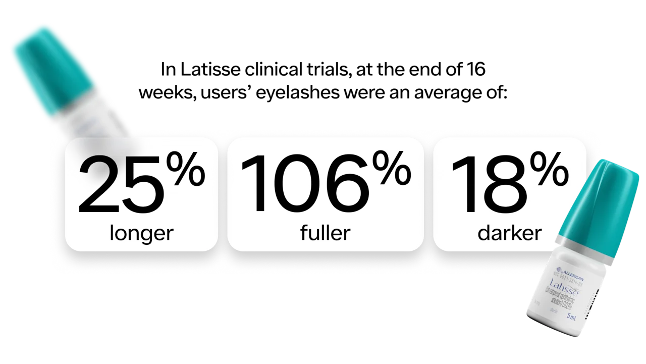 The numbers don’t lie. In Latisse clinical trials, at the end of 16 weeks, users’ eyelashes were an average of 25% longer, 106% fuller, and 18% darker.
