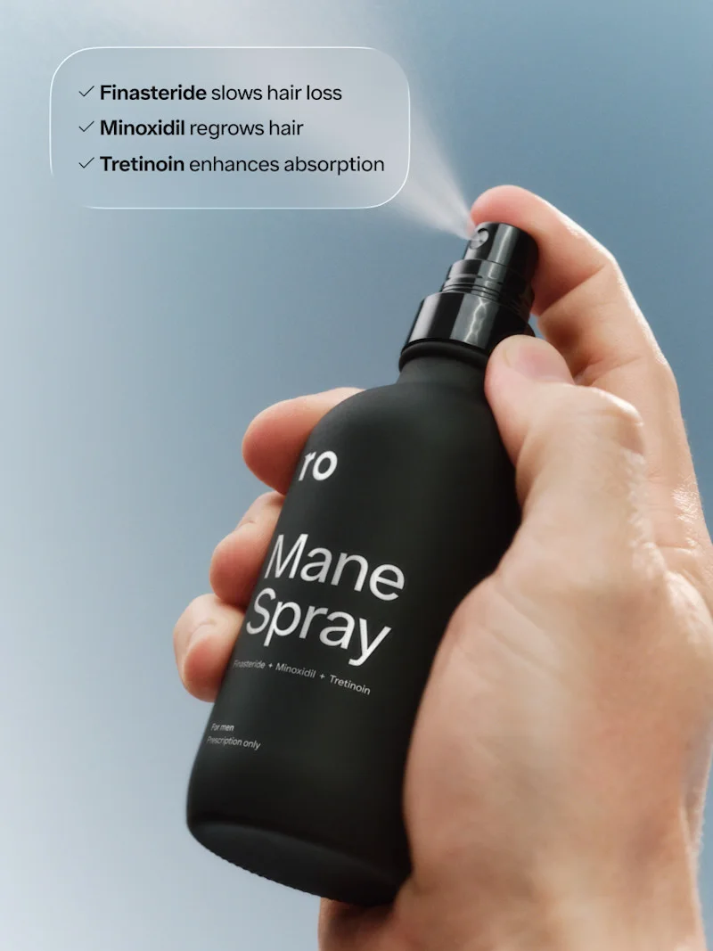 Ro Mane Spray is made with finasteride to slow hair loss, minoxidil to regrow hair, and tretinoin to enhance absorption.