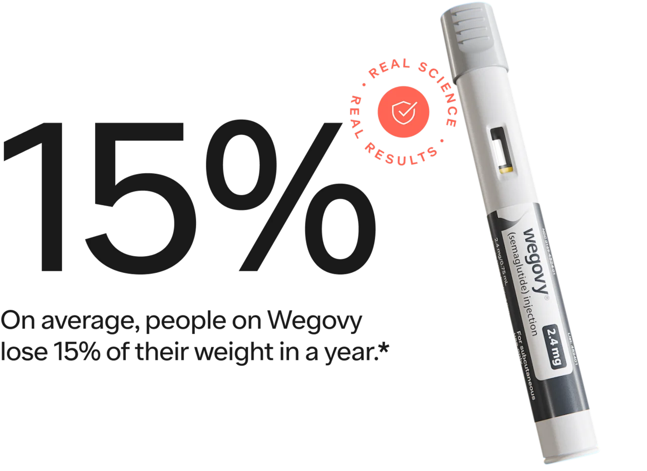 *Based on study of Wegovy 2.4 mg in non-diabetics with obesity, or with overweight plus a weight-related condition, when paired with healthy lifestyle changes. Average weight loss in 1 year is 15% (compared to 2.4% with diet and exercise alone).