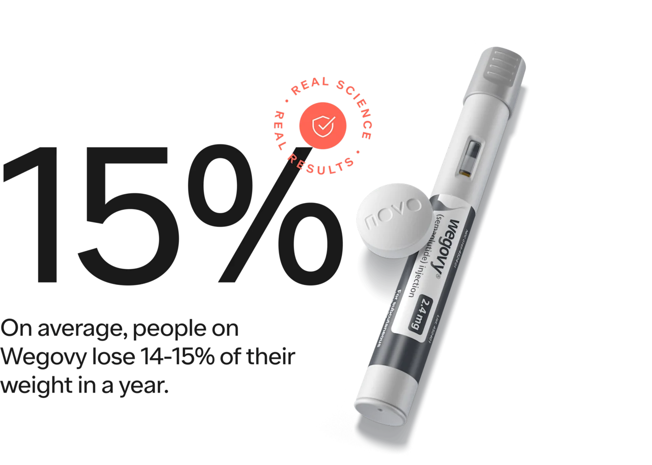 *Based on study of Wegovy 2.4 mg in non-diabetics with obesity, or with overweight plus a weight-related condition, when paired with healthy lifestyle changes. Average weight loss in 1 year is 15% (compared to 2.4% with diet and exercise alone).