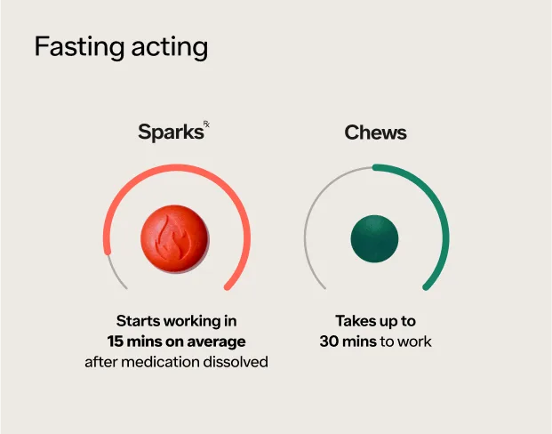 Ro Sparks are very intentionally designed to dissolve under your tongue for several minutes as opposed to instantly. This maximizes the amount of medication delivered directly to your bloodstream for a faster effect, compared to rapid-dissolving or swallowed tablets which are often absorbed through your digestive tract.