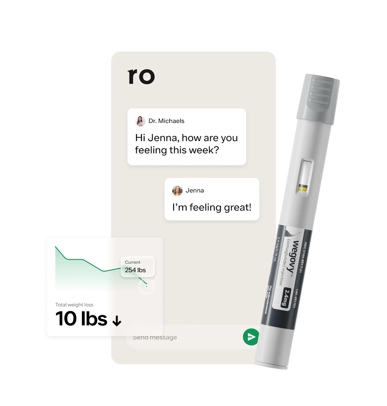 Medication costs are separate from your Ro Body membership ($45 first month, $145/mo thereafter), which includes our insurance concierge, provider visits, ongoing coaching, and anytime messaging. Learn more about pricing here.