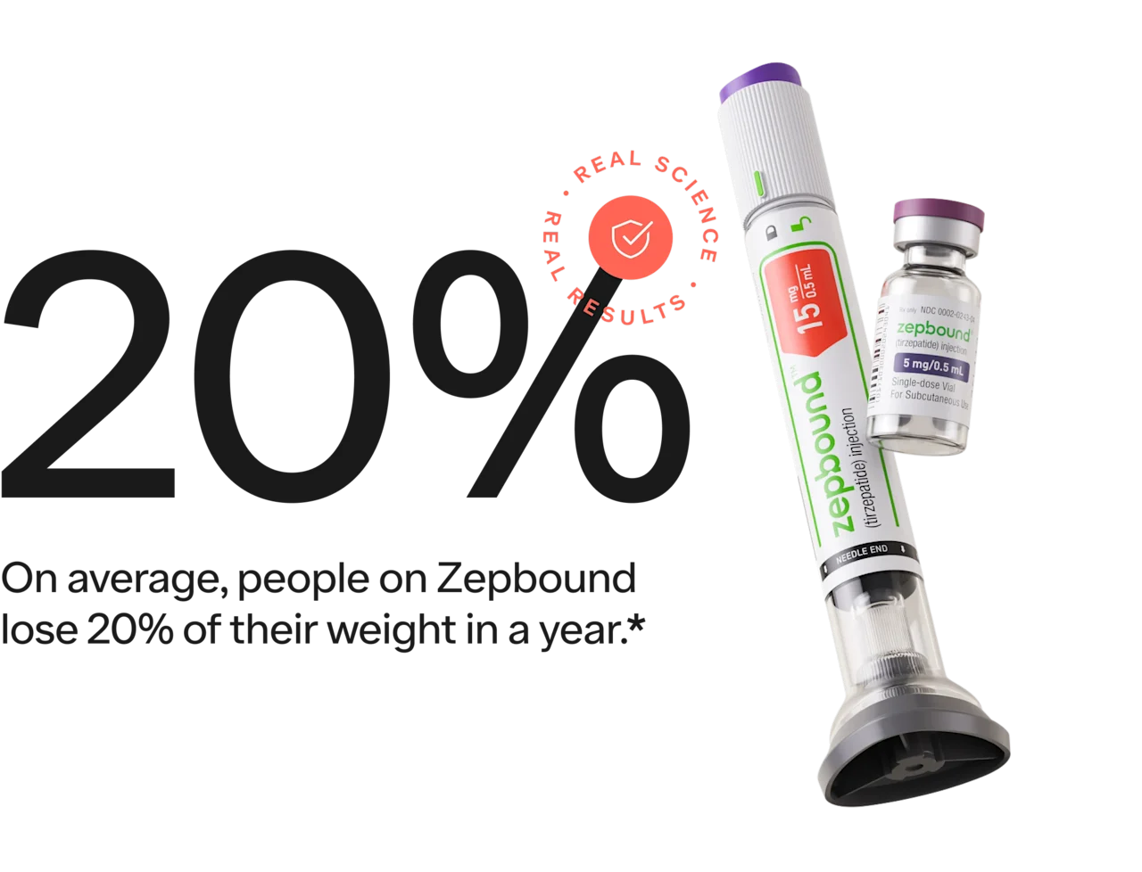 *Average weight loss in 1 year is 20% (compared to 3.1% with diet and exercise alone). Based on a 72-week clinical trial studying the highest doses of Zepbound in non-diabetic patients with obesity, or with overweight plus a weight-related condition, when paired with healthy lifestyle changes.