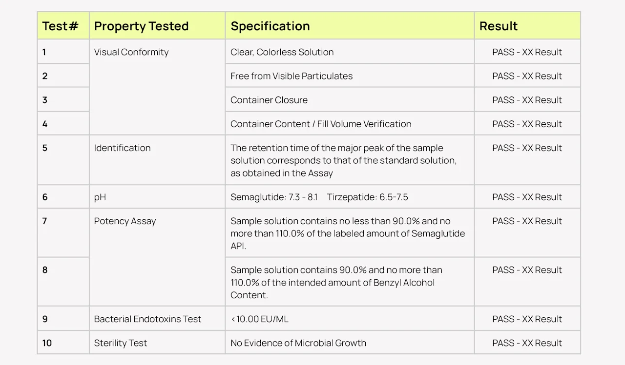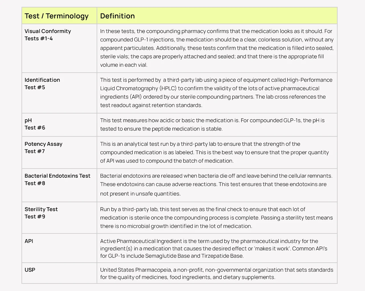 Ro’s compounded GLP-1 CoAs share in detail the various tests performed on every batch of medication. Each test performed must meet established acceptance criteria based on industry standards and validated testing methods. To help patients better and more easily understand the results, we clearly define what each test is and what it measures.