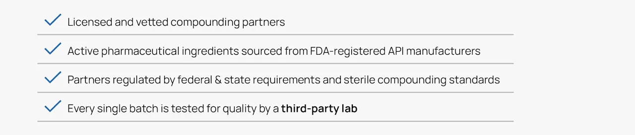 As part of Ro’s commitment to quality, we have extensive quality control and assurance measures for our compounded GLP-1 medications. Ro works with thoroughly vetted compounding partners who source the active pharmaceutical ingredients (API) used in the compounded medication only from FDA-registered manufacturers. Our partners are also subject to federal and state requirements as well as sterile compounding standards set by the United States Pharmacopeia (USP).