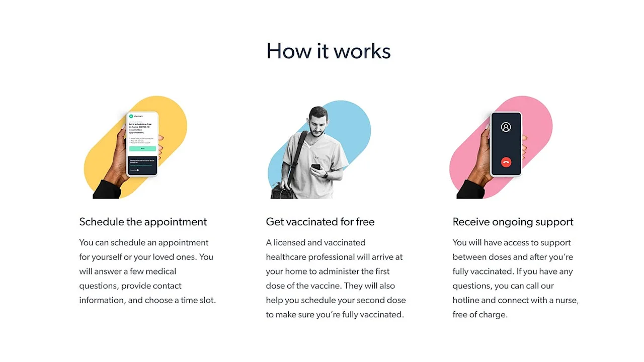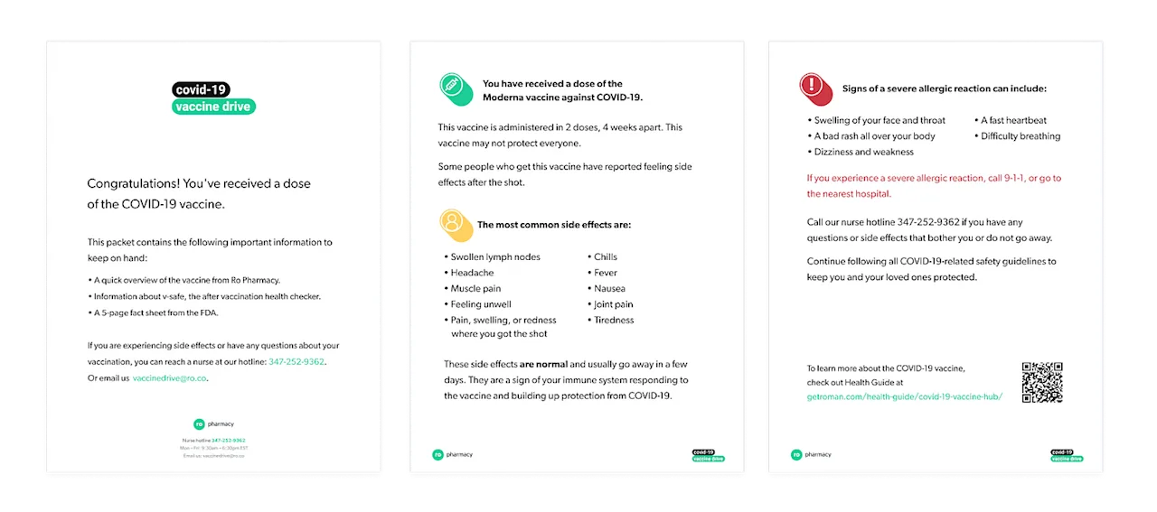 Last but not least, the patients will receive educational materials and a phone number to Ro’s nurse hotline should any questions arise. And their second vaccination will be scheduled on-site.