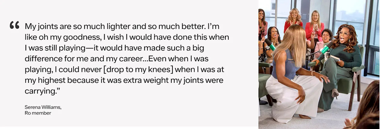 On the podcast, Serena spoke authentically about how being on Ro has helped her make meaningful progress toward improving her health and overall wellbeing. Beyond weight loss, she shared that she feels happier, has more energy for her kids, and now “has knees like Megan”—even demonstrating it for the audience in a moment that elicited uproarious applause. The exchange underscored just how much better she’s feeling in her body since beginning her journey on Ro.