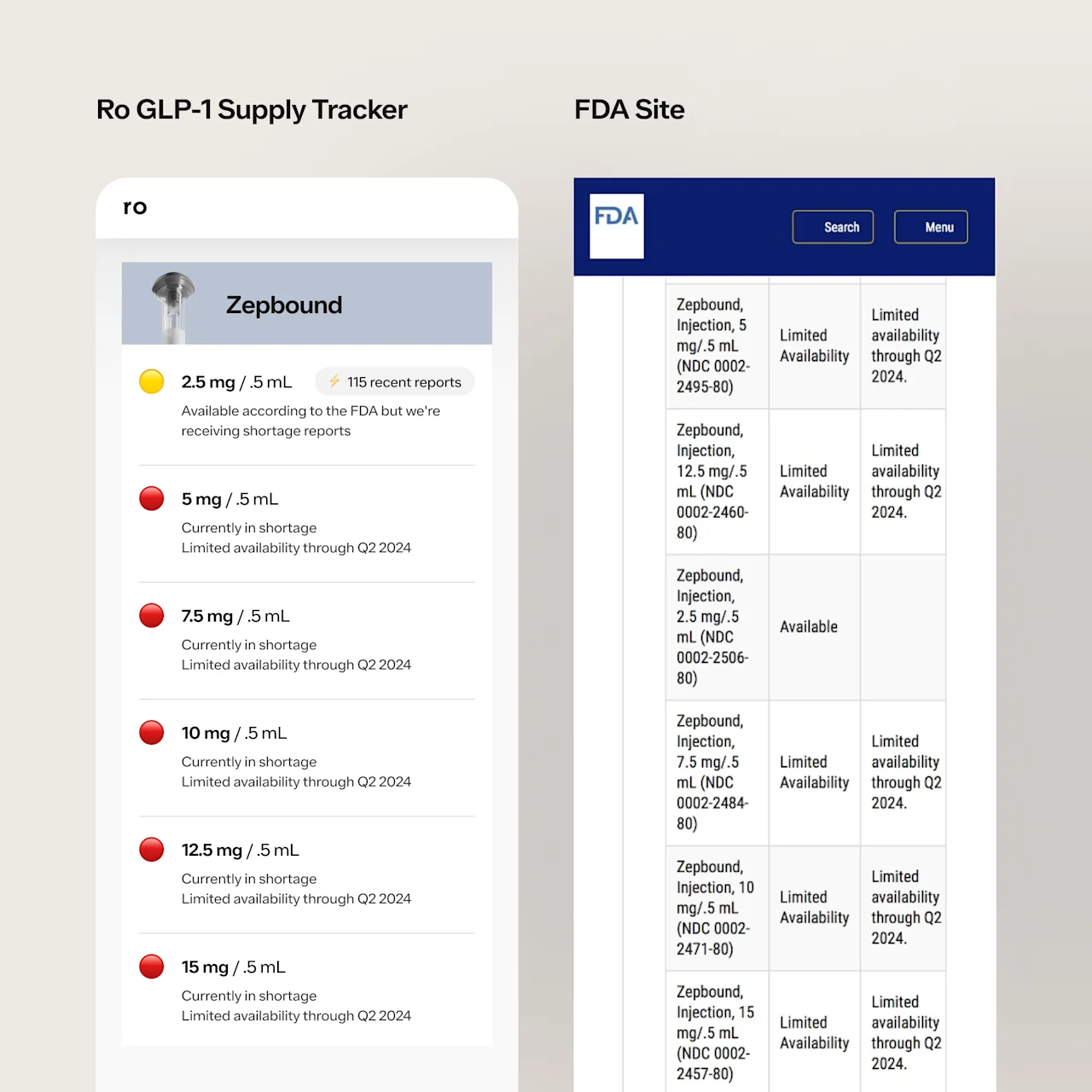 From a patient and provider’s perspective, the official FDA shortage list unfortunately doesn’t always reflect patients’ reality in real-time (it was never designed to do so and it’s not an inventory management system). For example, while a certain dose of Zepbound may not be listed officially on shortage, it may not actually be available to the hundreds of thousands of patients who need it. We’ve seen this type of situation occur many times over the last two years. It became clear that we needed a better way to help patients both navigate the shortage and find supply other than simply calling pharmacies and pointing to the FDA’s website.