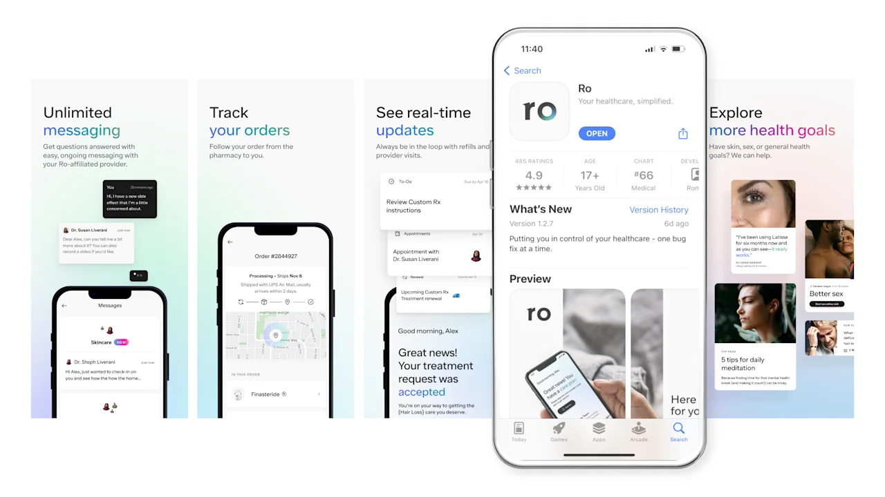 November 30, 2022 - Ro, the only direct-to-patient company that combines telehealth, diagnostics, labs, and pharmacy services nationwide, today announced its first iOS mobile app to offer patients the most convenient and effective way to achieve their health goals. The app is a one-stop destination for patients to seamlessly manage their care as well as find any of Ro’s products and services across sexual health and fertility, skincare, weight loss, and more, through a newly designed mobile-first experience.