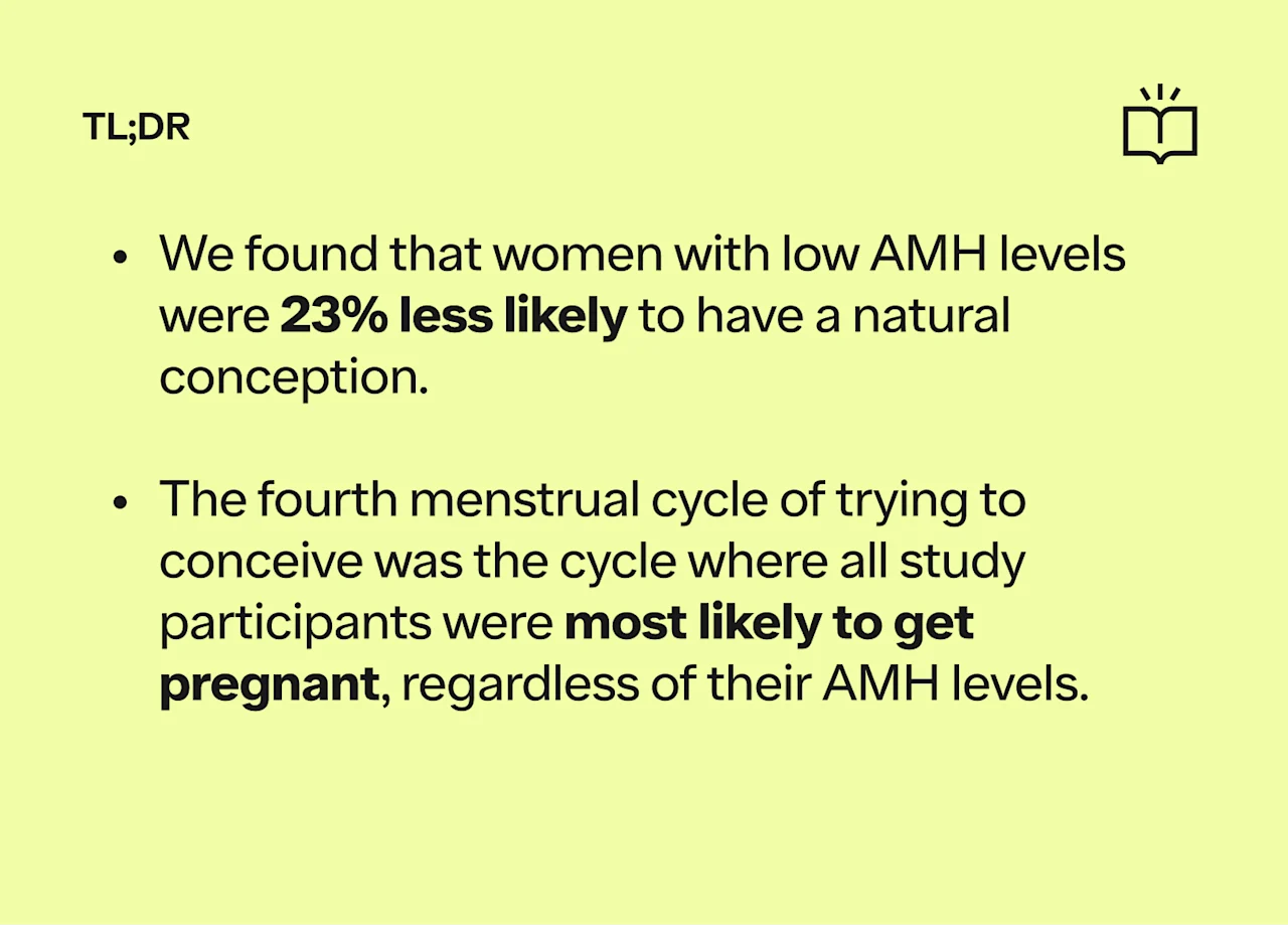 Given the significance of AMH in reproductive health, researchers have long wondered whether AMH levels could directly impact the chance of conceiving naturally. Although it has been hypothesized that serum AMH levels might serve as a predictive marker for conception, previous studies have had mixed results, largely due to limitations in study size. To shed light on this important question, Ro embarked on a comprehensive study involving 3,150 patients who had purchased a Modern Fertility hormone test and reported actively trying to conceive for more than three months.