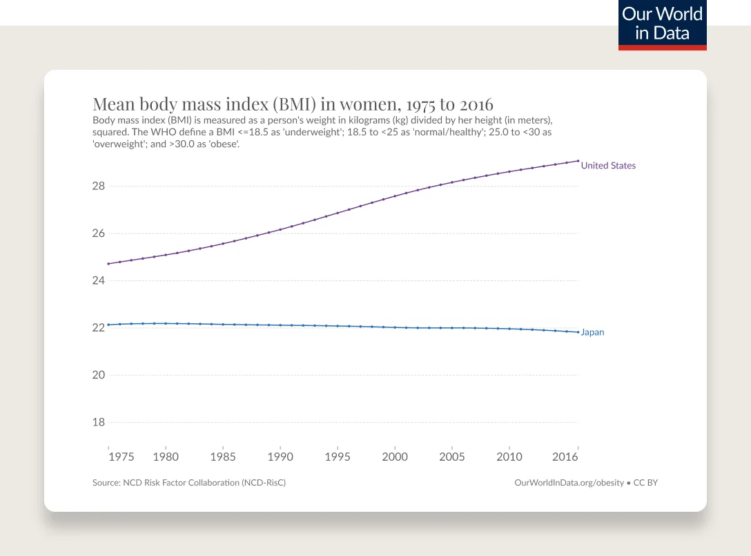 But breaking down Japan even further, you see the average is more so driven down by the BMI of women shrinking over time, which is astounding (note: the BMI of men is still increasing over time, just not nearly as drastically as the US).