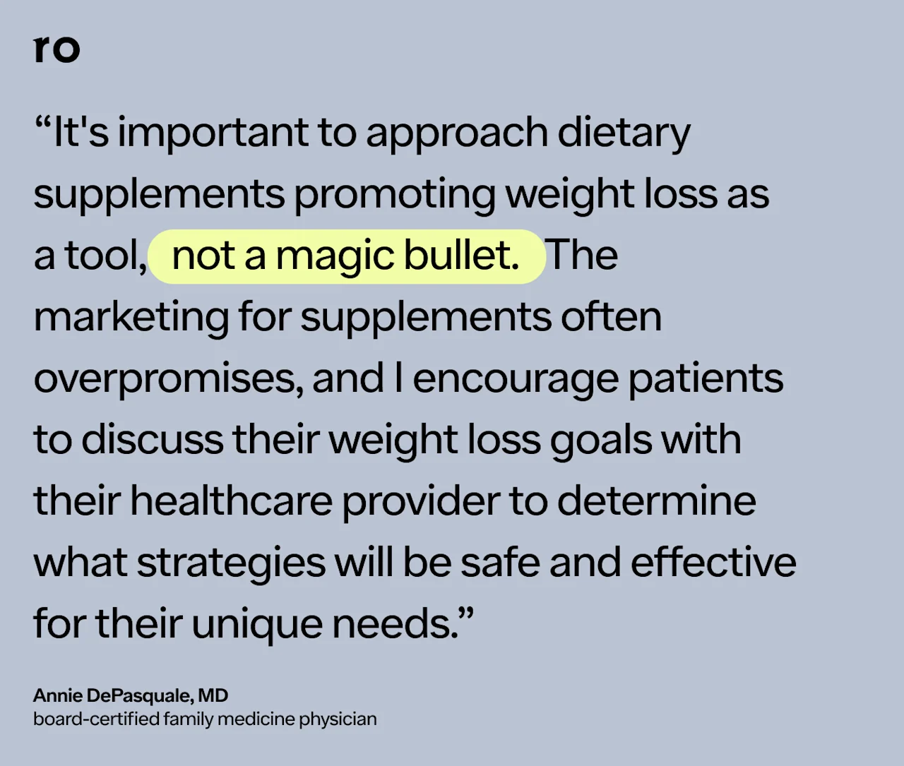 “It's important to approach dietary supplements promoting weight loss as a tool, not a magic bullet,” Dr. DePasquale says. “The marketing for supplements often overpromises, and I encourage patients to discuss their weight loss goals with their healthcare provider to determine what strategies will be safe and effective for their unique needs.”