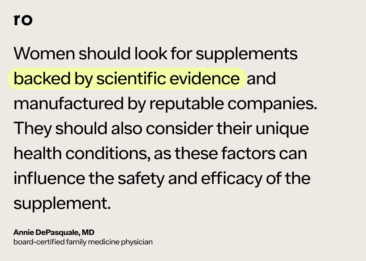“Women should look for supplements backed by scientific evidence and manufactured by reputable companies,” says board-certified family medicine physician Annie DePasquale, MD. “They should also consider their unique health conditions, as these factors can influence the safety and efficacy of the supplement.”