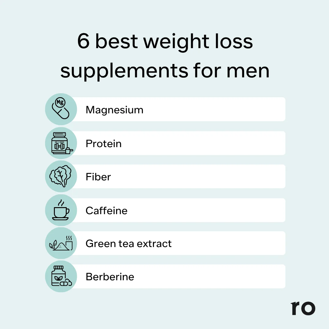 The best weight loss supplements for men include protein, fiber, magnesium, caffeine, green tea extract, and berberine.
