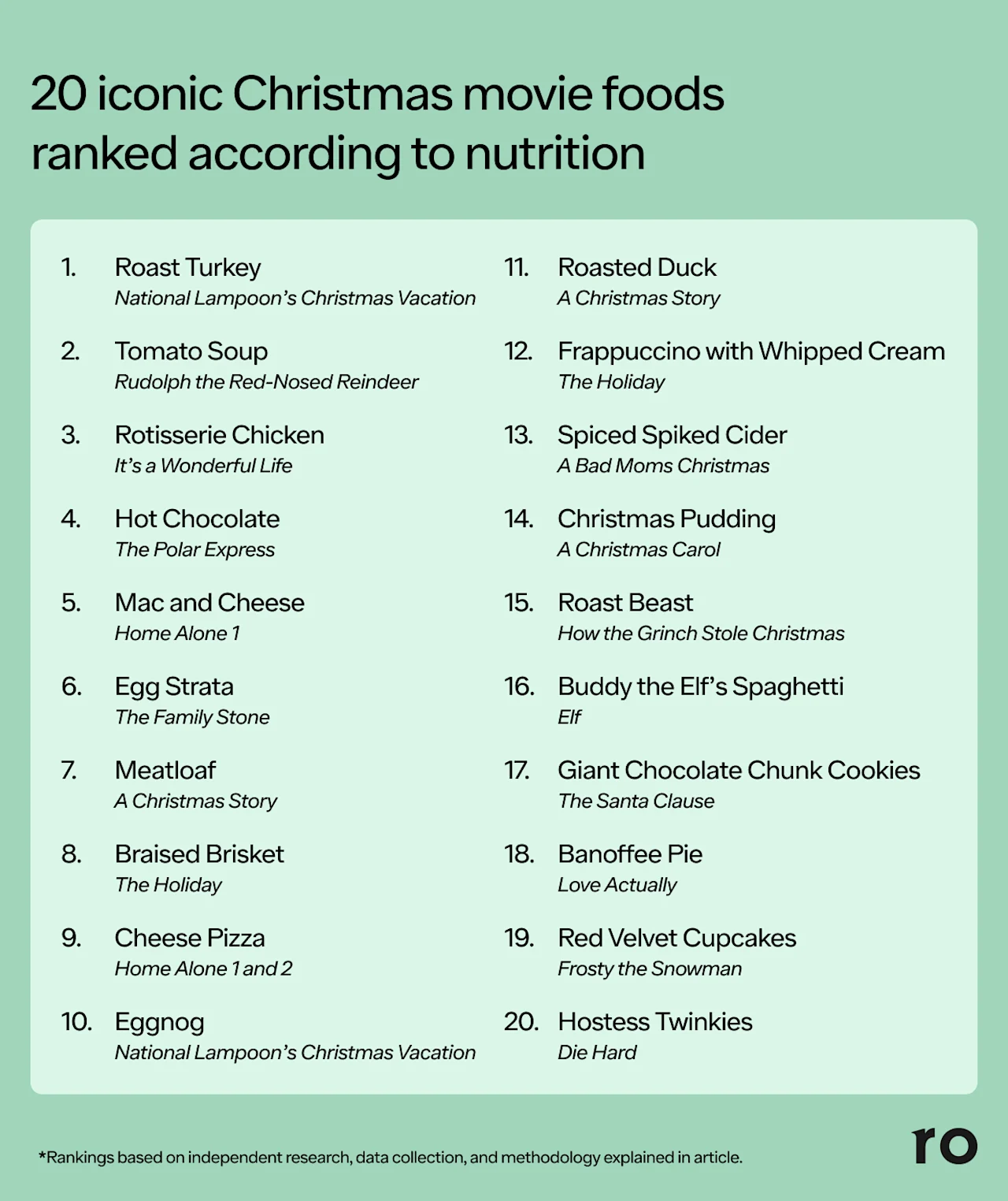 So, which Christmas movie culinary delights are the healthiest? To answer that question, Ro curated a list of some of the most iconic dishes, drinks, and desserts—for the sake of this article, we’ll just refer to them all as “foods”—featured in fan-favorite flicks. Then, we reviewed recipes, such as those in The Christmas Movie Cookbook by Julia Rutland, analyzed their nutrition content, and interviewed experts to discover Hollywood’s healthiest holiday bites and beverages (say that five times fast!), based on which ones had the: