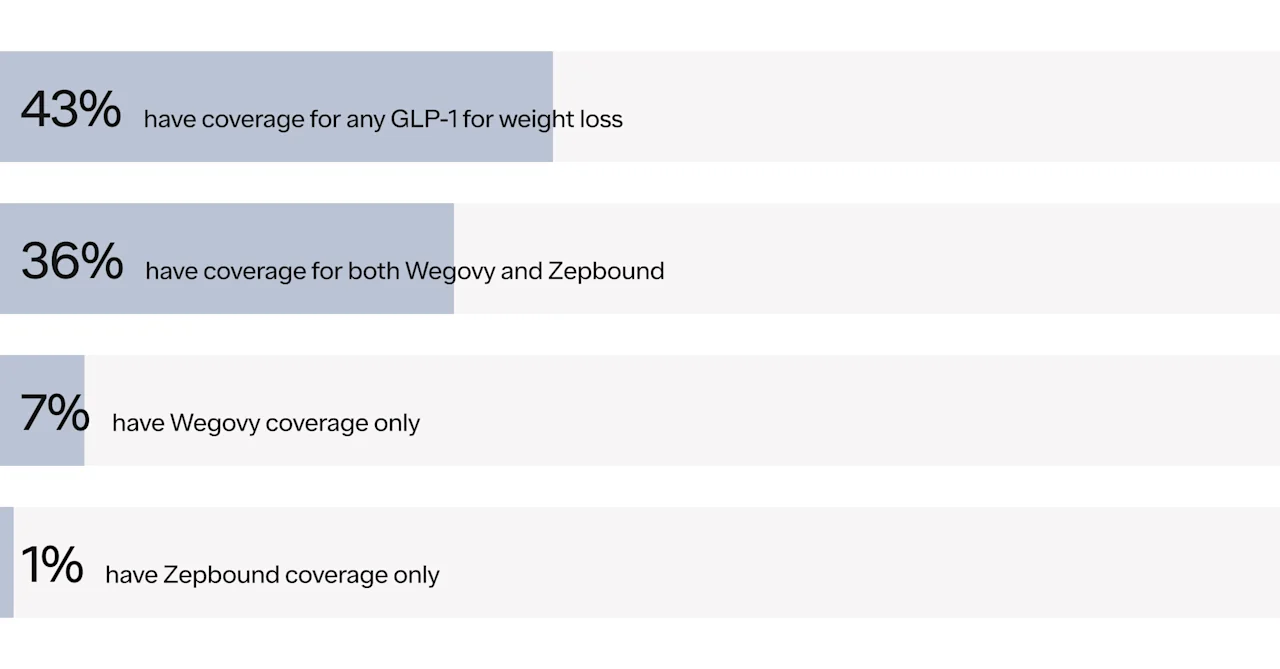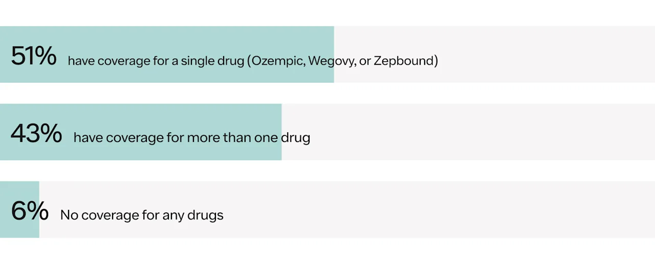 Coverage for GLP-1s: 43% have coverage of a GLP-1 for weight loss, and nearly all have coverage for a GLP-1 for type 2 diabetes (T2D).