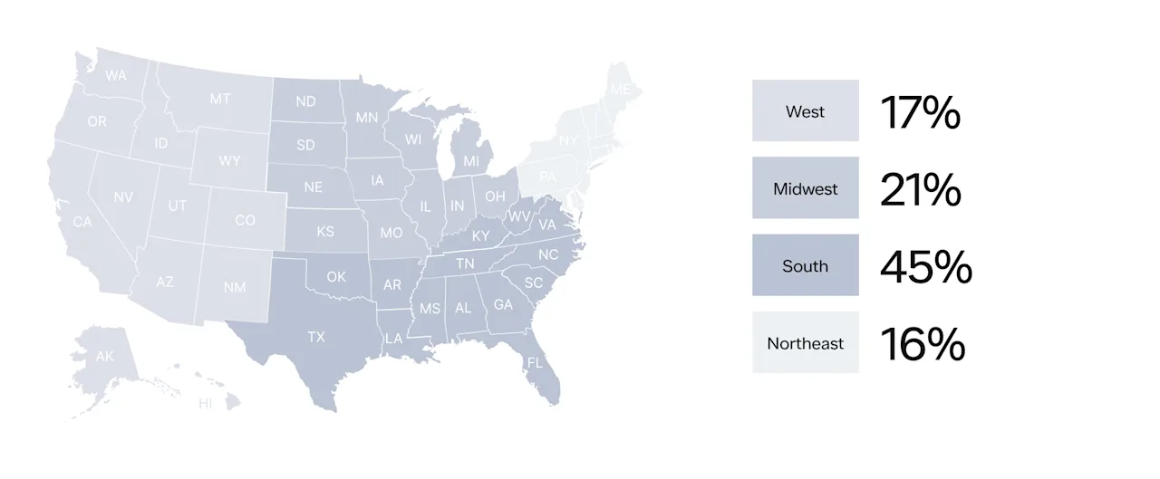 Geographic Distribution: A significant portion of users are located in the Southern states.