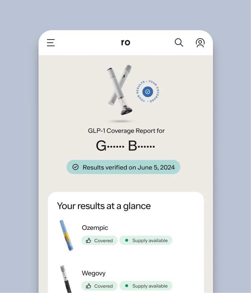 We built the GLP-1 Insurance Coverage Checker to help you take control of your care—not get stuck in a maze of paperwork or confusing coverage rules. Plus, patients who sign up for a Ro membership are supported by an insurance concierge who can help navigate further steps in the insurance coverage process, like submitting prior authorization requests and finding out estimated co-pays.
