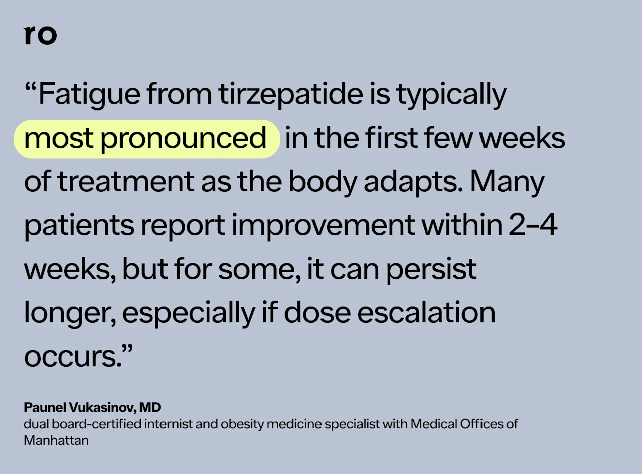 “Fatigue from tirzepatide is typically most pronounced in the first few weeks of treatment as the body adapts,” Dr. Vukasinov says. “Many patients report improvement within 2–4 weeks, but for some, it can persist longer, especially if dose escalation occurs.”