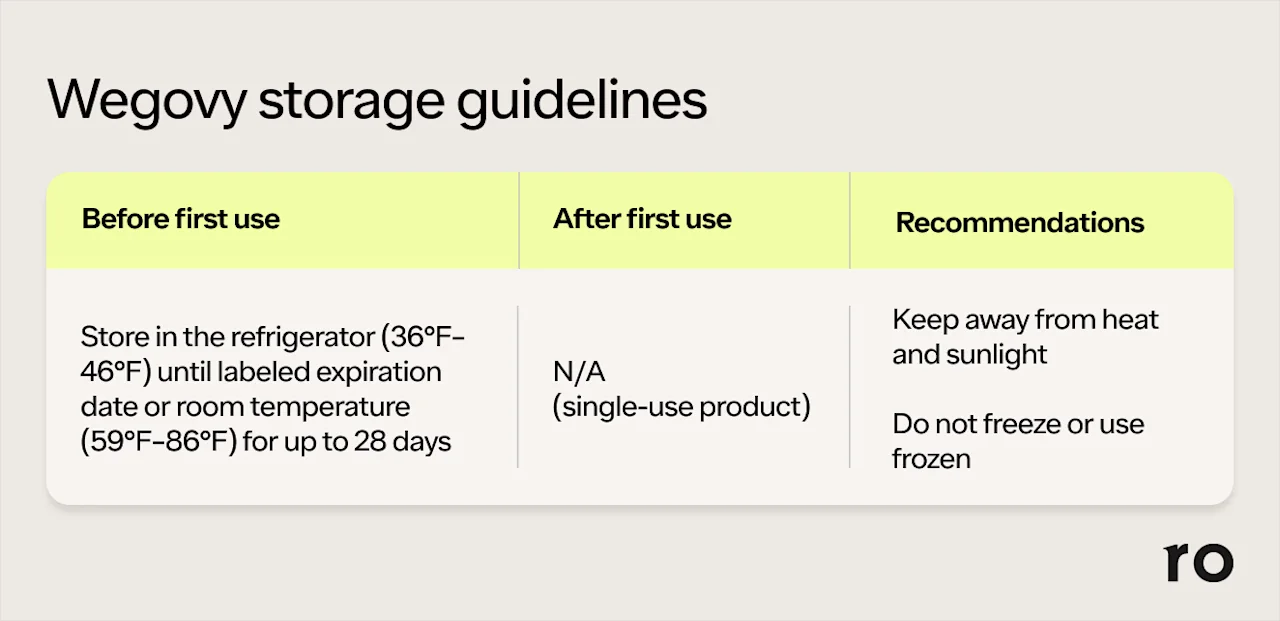 Ideally, Wegovy should be kept refrigerated. But, if necessary, the medication can be stored at room temperature (46°F-86°F) for up to 28 days, as long as the pen remains capped. To help you remember, write down the date you took it out of the fridge (or, better yet, calculate the date 28 days in the future and make a note to toss the pen if you don’t use it by then). When Wegovy isn’t in the fridge, make sure to keep it in its original carton and out of direct sunlight.