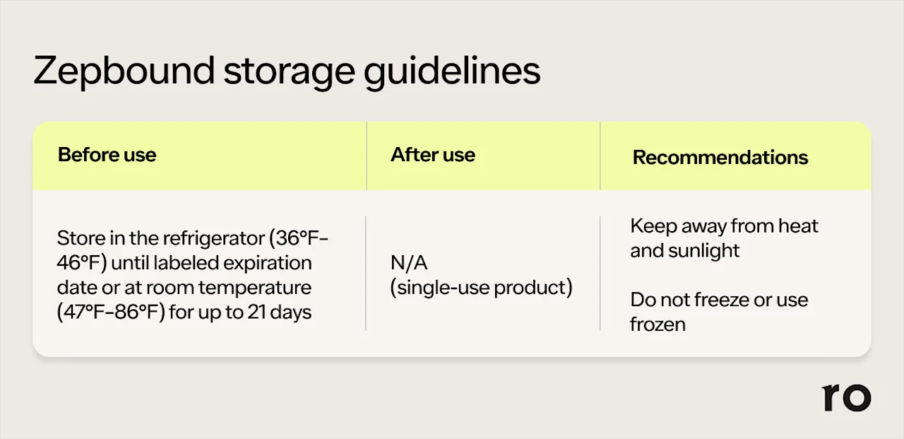 First things first: Keep Zepbound in its original packaging. Beyond that, the main thing to consider is temperature. Zepbound pens and vials can remain unrefrigerated at temperatures between 47°F and 86°F for up to three weeks.