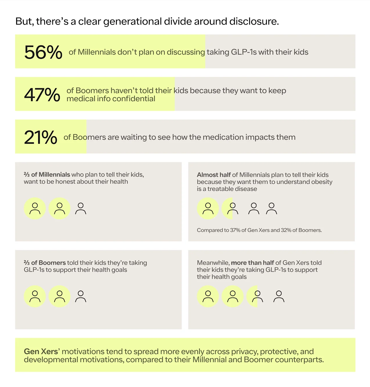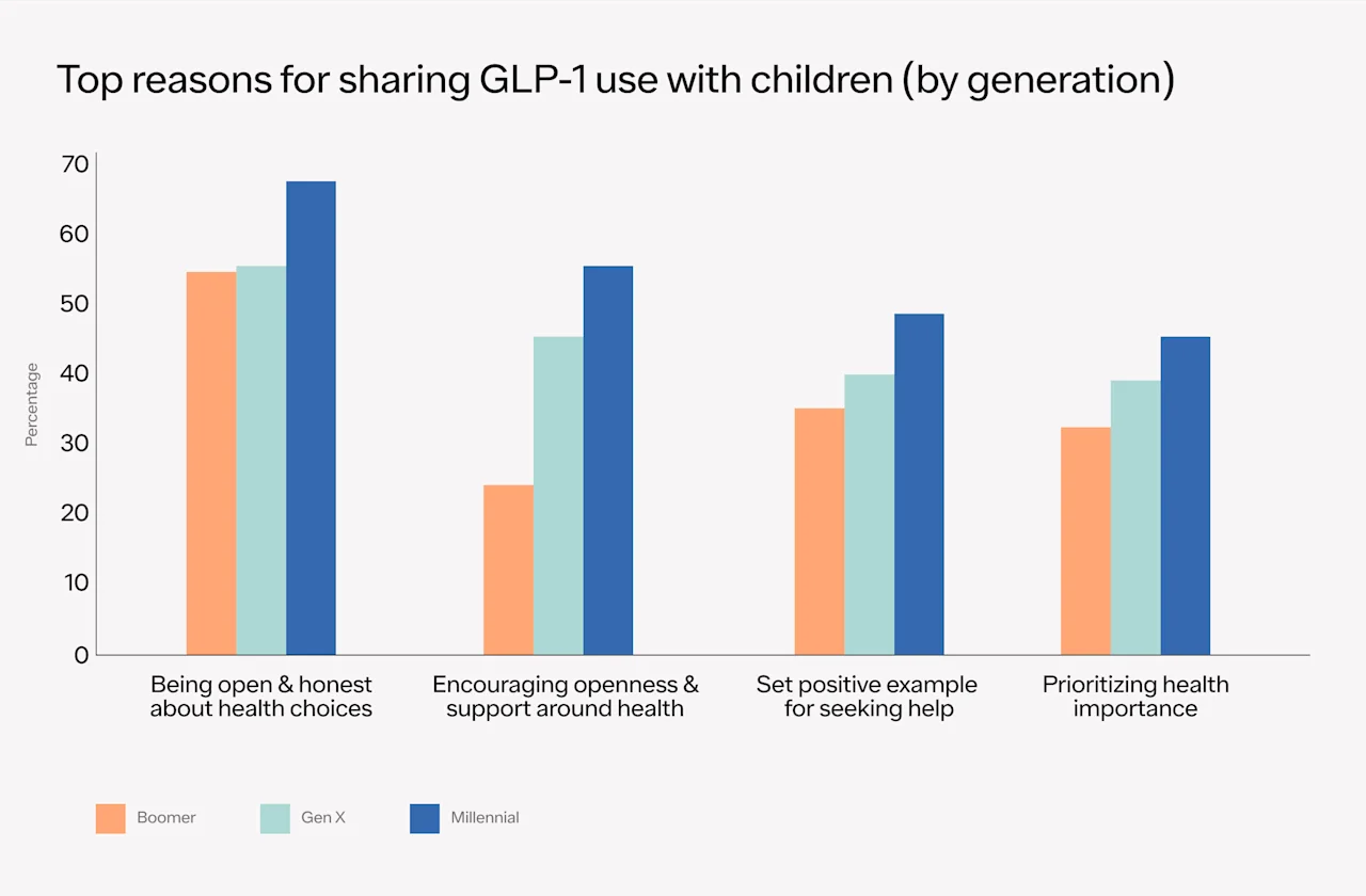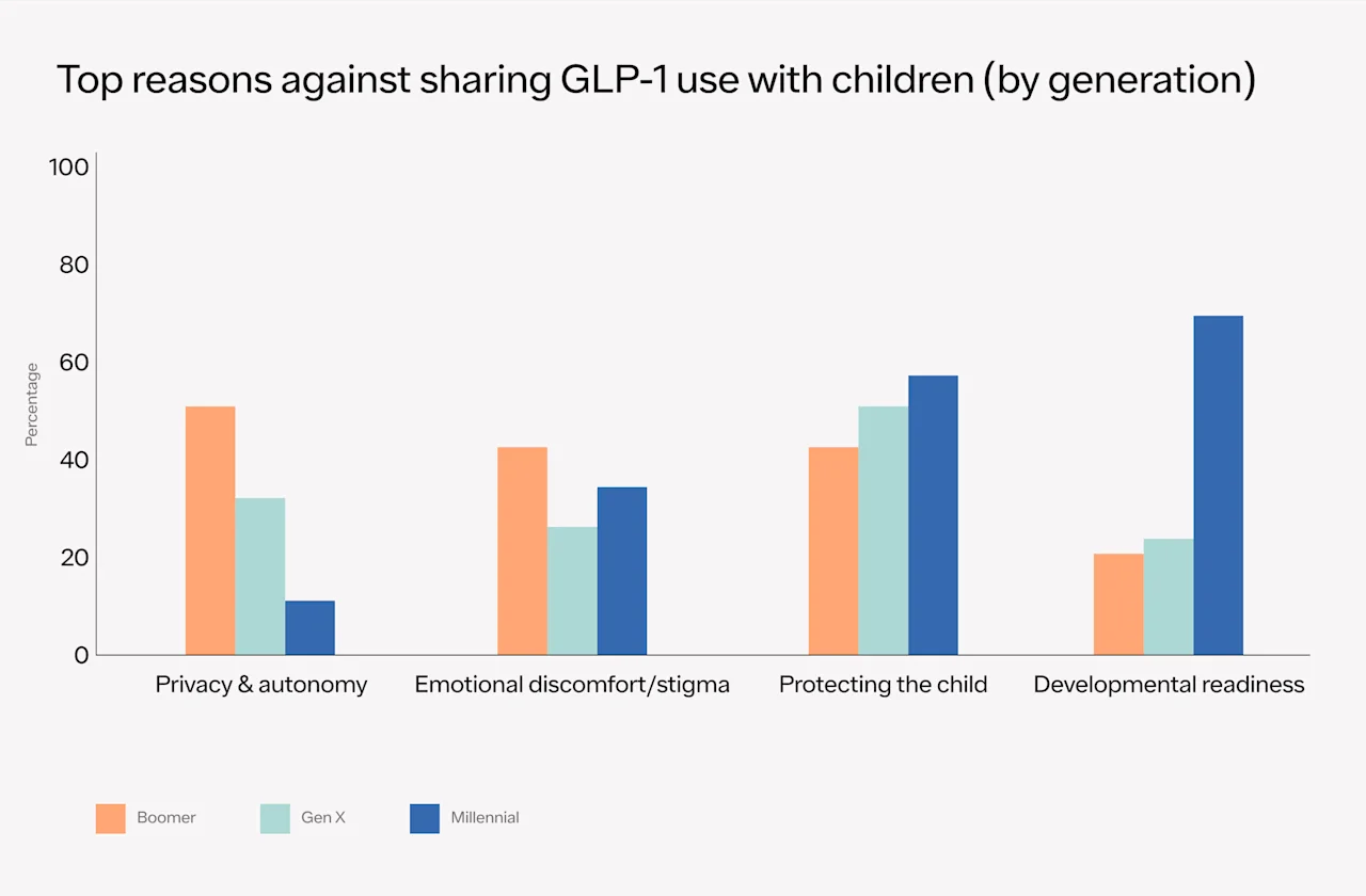 Whether they choose to share or keep it private, parents are thoughtful and deliberate. They see their GLP-1 as more than just a medication, and as part of a broader story about how they care for themselves and model that care for others. The motivations behind telling their kids change by generation: while Boomers are most likely to cite privacy and autonomy as reasons for not sharing that they’re on a GLP-1, Millennials strongly emphasize developmental readiness, with far more concern that their child is too young or the timing isn’t right. Whether through actions or conversations, it’s clear that parents are using their GLP-1 journeys to rewrite what family health looks like.