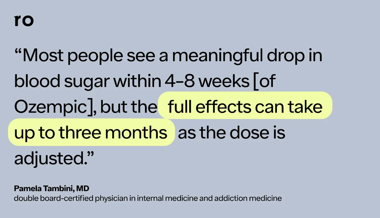 “Ozempic starts working in the body shortly after the first dose, but noticeable improvements in blood sugar levels usually take a few weeks,” Dr. Tambini says. “Most people see a meaningful drop in blood sugar within 4–8 weeks, but the full effects can take up to three months as the dose is adjusted.”