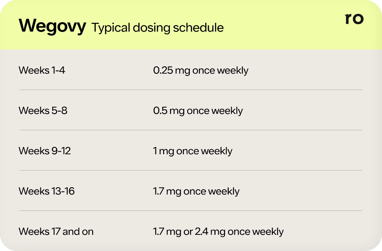 The typical starting dose of Wegovy is 0.25 mg. So, if you’re taking the medication for the first time, odds are you’ll be using a prefilled pen containing 0.25 mg each week, for at least four weeks. When just starting treatment, it’s important to choose a day of the week when you can reliably be available to give yourself the injection, since consistency is key for seeing results (and avoiding worsened side effects) on Wegovy. Follow the instructions included with your package of Wegovy and any guidance from your healthcare provider to administer the injection.