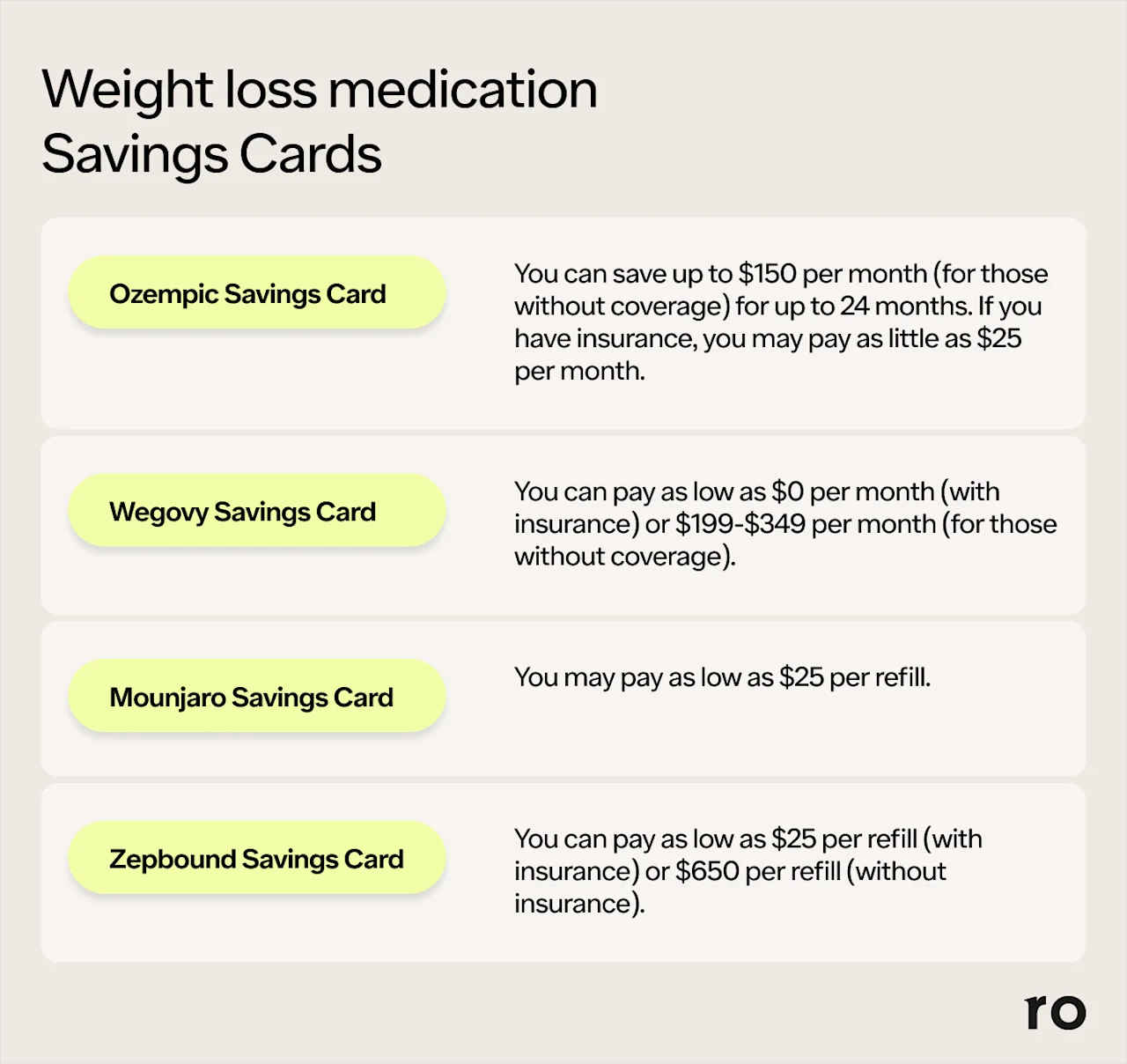 If you have insurance through your work, you may be eligible for manufacturer savings cards — even if your plan does not specifically provide coverage for weight loss drugs. These savings cards can cut the cost of a medication roughly in half, or bring it down to as low as $0 to $25 for a one-month supply.