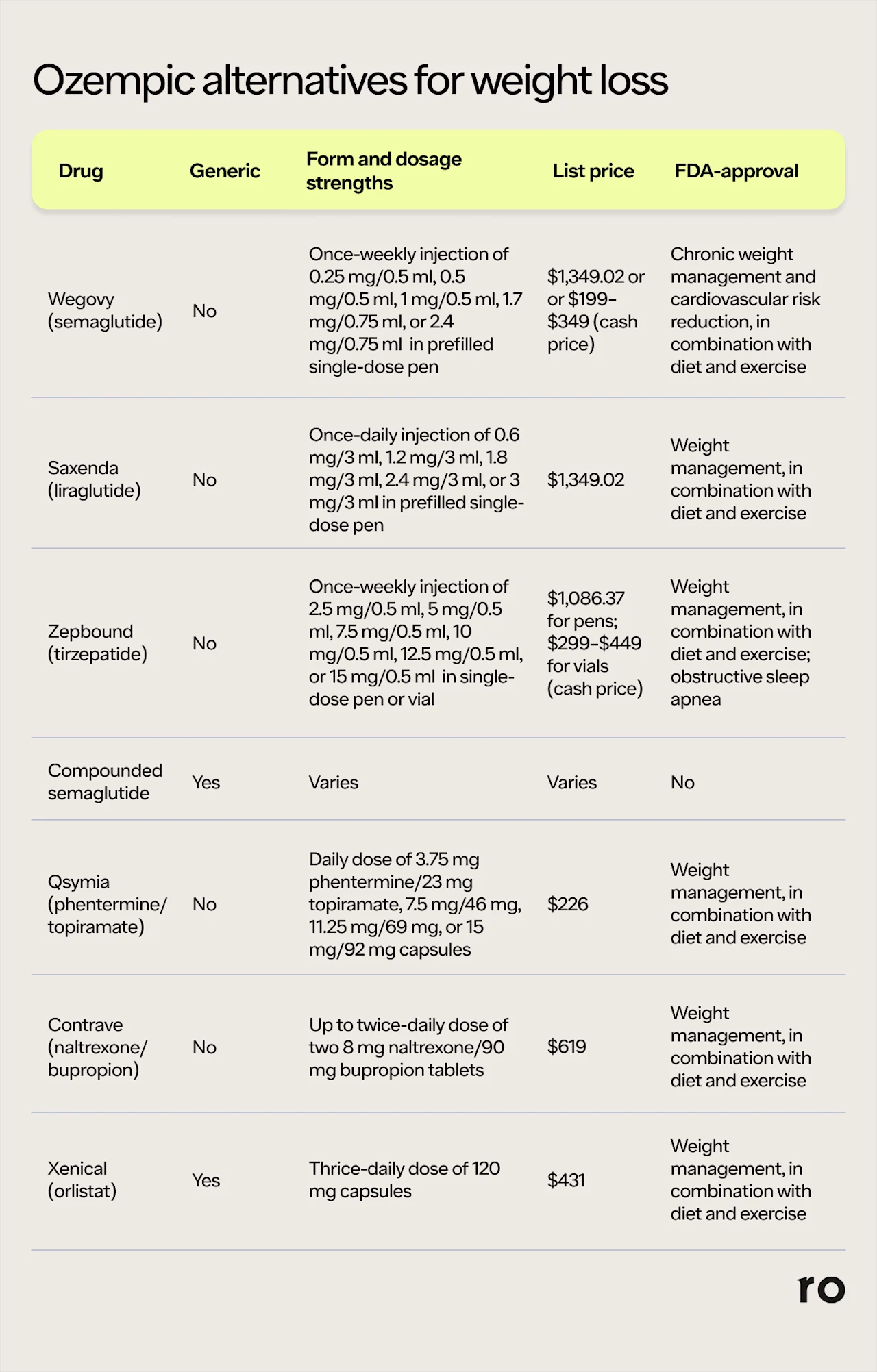 Some alternatives are FDA-approved for weight loss and management. Wegovy and Zepbound are weekly injections, while Saxenda is daily.