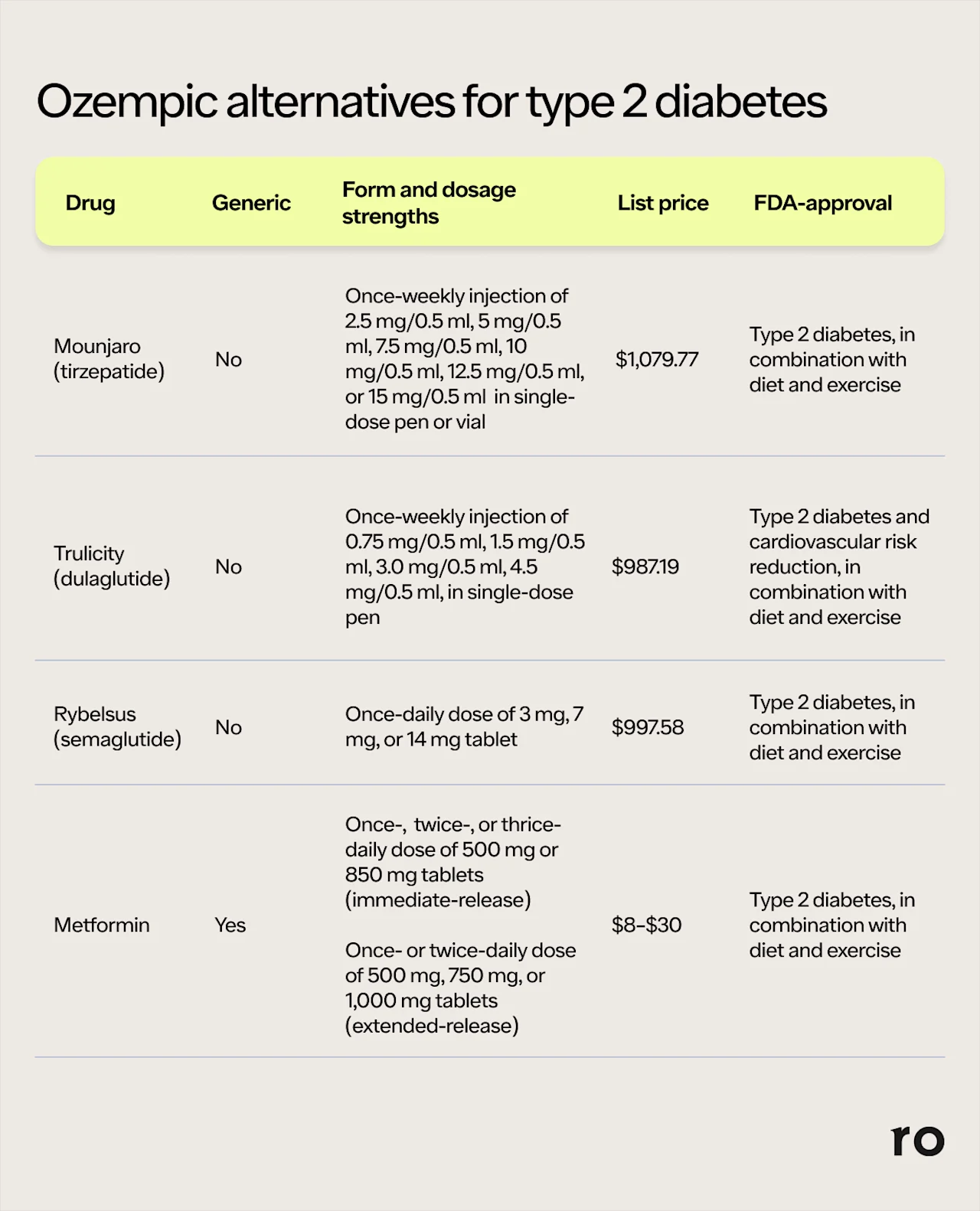 Ozempic alternatives include other GLP-1 agonists, such as those that are FDA-approved to treat type 2 diabetes (e.g. Mounjaro, Trulicity, Rybelsus) and for chronic weight management (e.g. Wegovy, Zepbound).