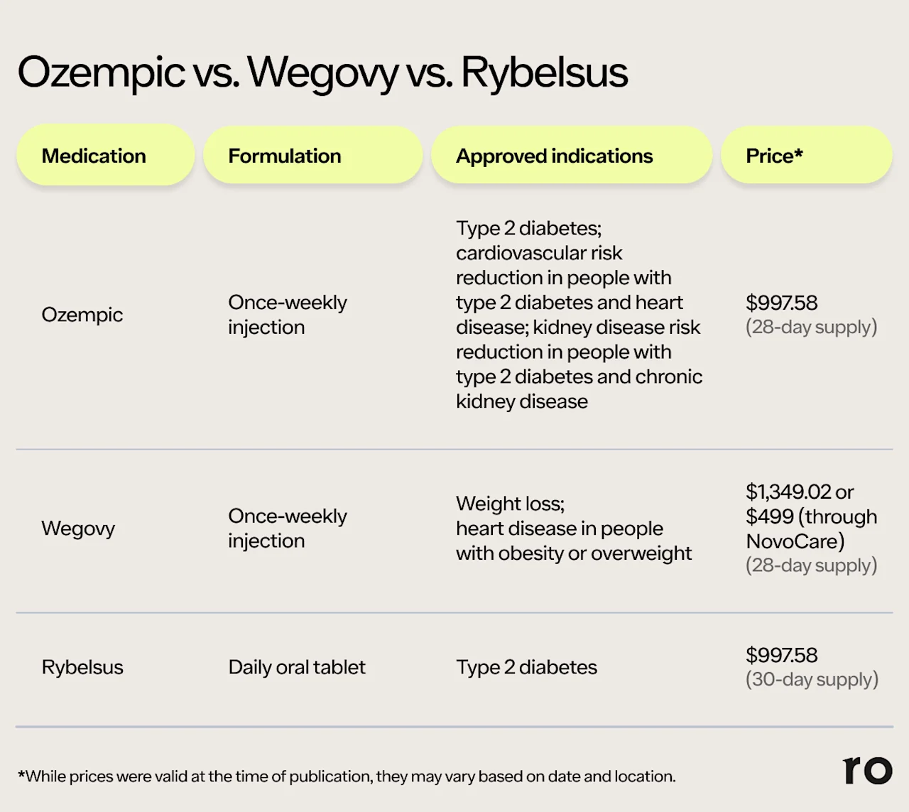 Semaglutide is the active ingredient in Ozempic and two other brand-name drugs, Wegovy and Rybelsus. All three medications are prescription drugs, but they differ in approved indications, formulation, and price.