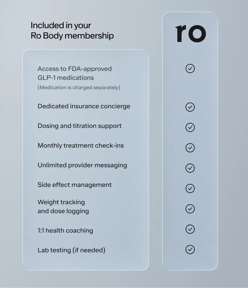 Ro’s insurance concierge will work with your insurance provider to determine coverage for your GLP-1 medication. Please note that this medication is paid for separately from your Ro Body membership, which is only available by cash pay only and does not accept insurance.
