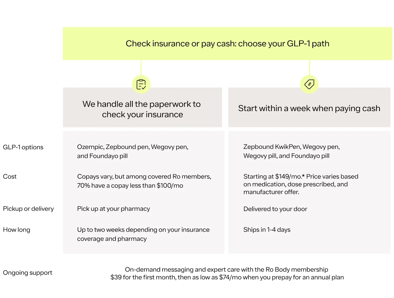 Ro’s insurance concierge will work with your insurance provider to determine coverage for your GLP-1 medication. Please note that this medication is paid for separately from your Ro Body membership, which is only available by cash pay only and does not accept insurance.