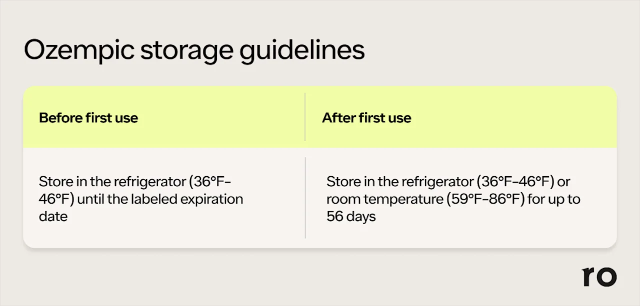 Unopened Ozempic pens should be stored in the refrigerator at 36°F–46°F until first use or the labeled expiration date. Once opened, it's safe to leave Ozempic pens out at room temperature (59°F–86°F) for up to 56 days—providing, of course, the medication is not exposed to any extreme temperatures and is stored properly.
