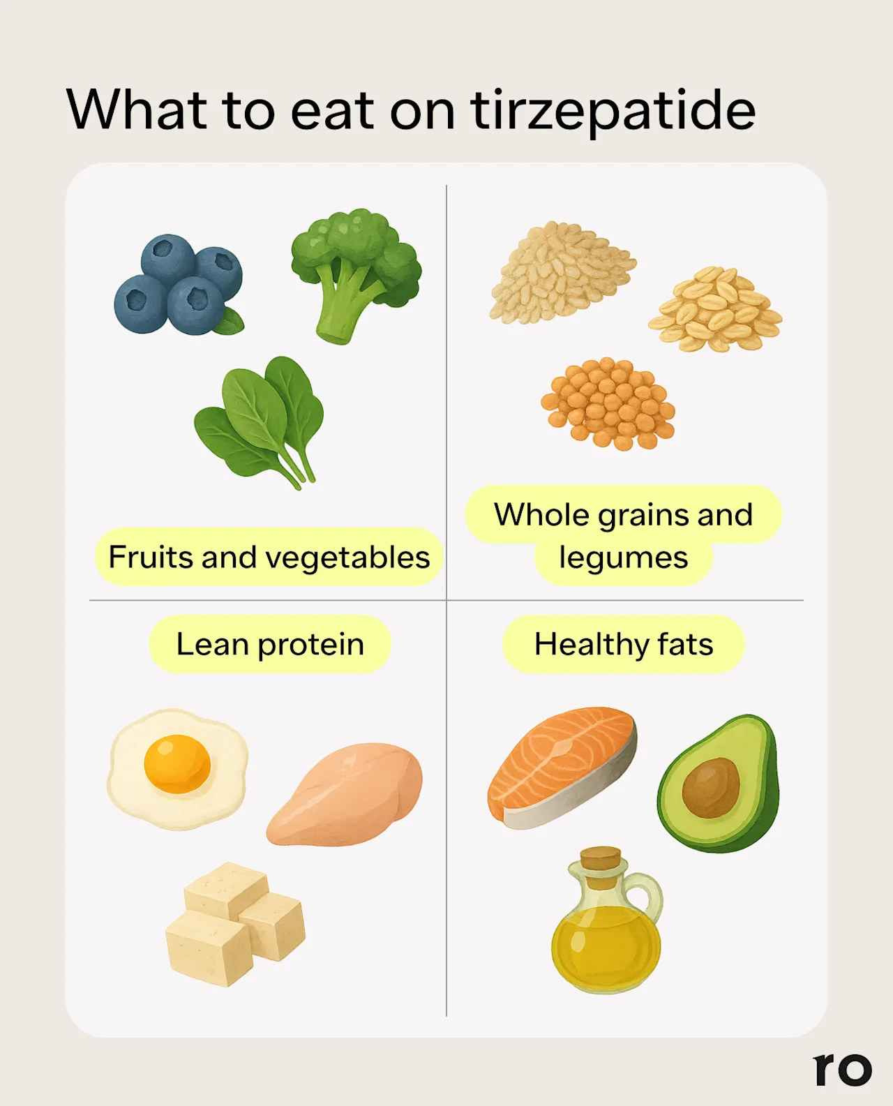 Prioritizing lean protein, fiber-rich fruits and vegetables, whole grains, and healthy fats can help you feel fuller for longer, support your overall nutrition, and reduce common side effects like constipation that can come with tirzepatide.