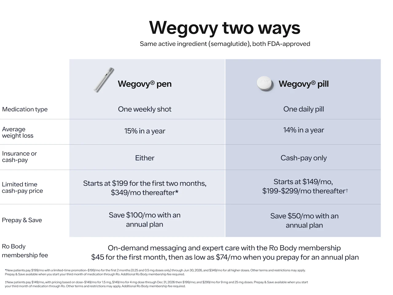 Paying cash? For a limited-time, new patients can start on the lower doses of Wegovy pill for $149/mo, and on the lower doses of Wegovy pen for $199/mo. The price of Wegovy increases for higher doses, but Prepay & Save on Ro unlocks even more savings.