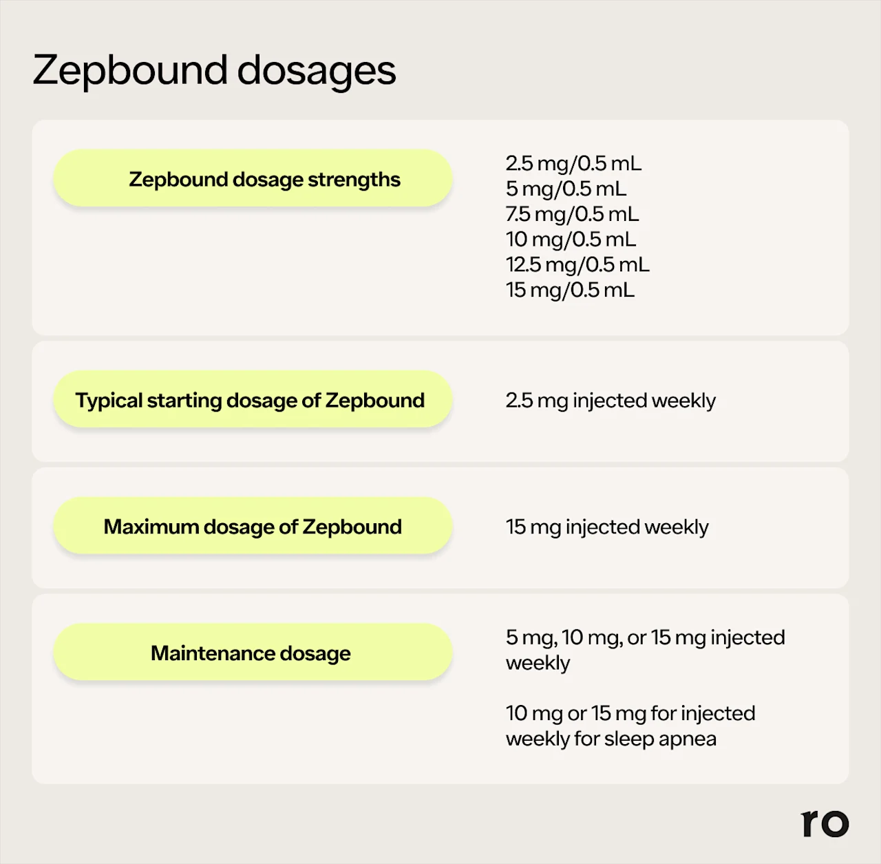 Typically, healthcare providers recommend starting with 2.5 mg of Zepbound weekly before increasing the dosage every four weeks until a maintenance dosage of 5 mg, 10 mg, or 15 mg is reached.