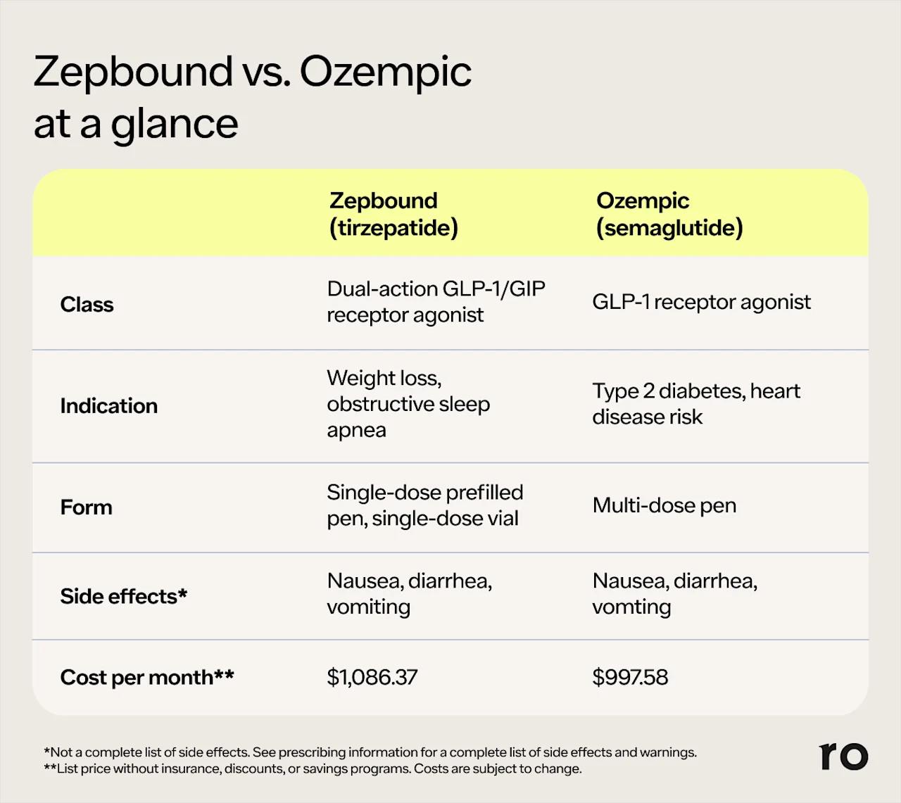 So, what is the difference between Zepbound and Ozempic? Here’s a quick recap of a few key distinctions between the drugs.