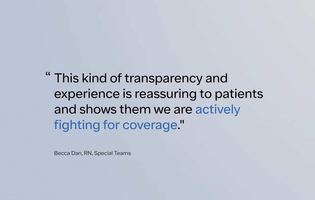 It's one thing to be told ‘We're waiting on insurance’ it's another thing to be told ‘We submitted the PA on this date, we usually hear back in 1-2 weeks, and here is information you can use to understand what the decision will mean for your treatment.’ This kind of transparency and experience is reassuring to patients and shows them we are actively fighting for coverage, and in the event medications aren't covered by their insurance, what comes next.” — Becca Dan, RN, Special Teams
