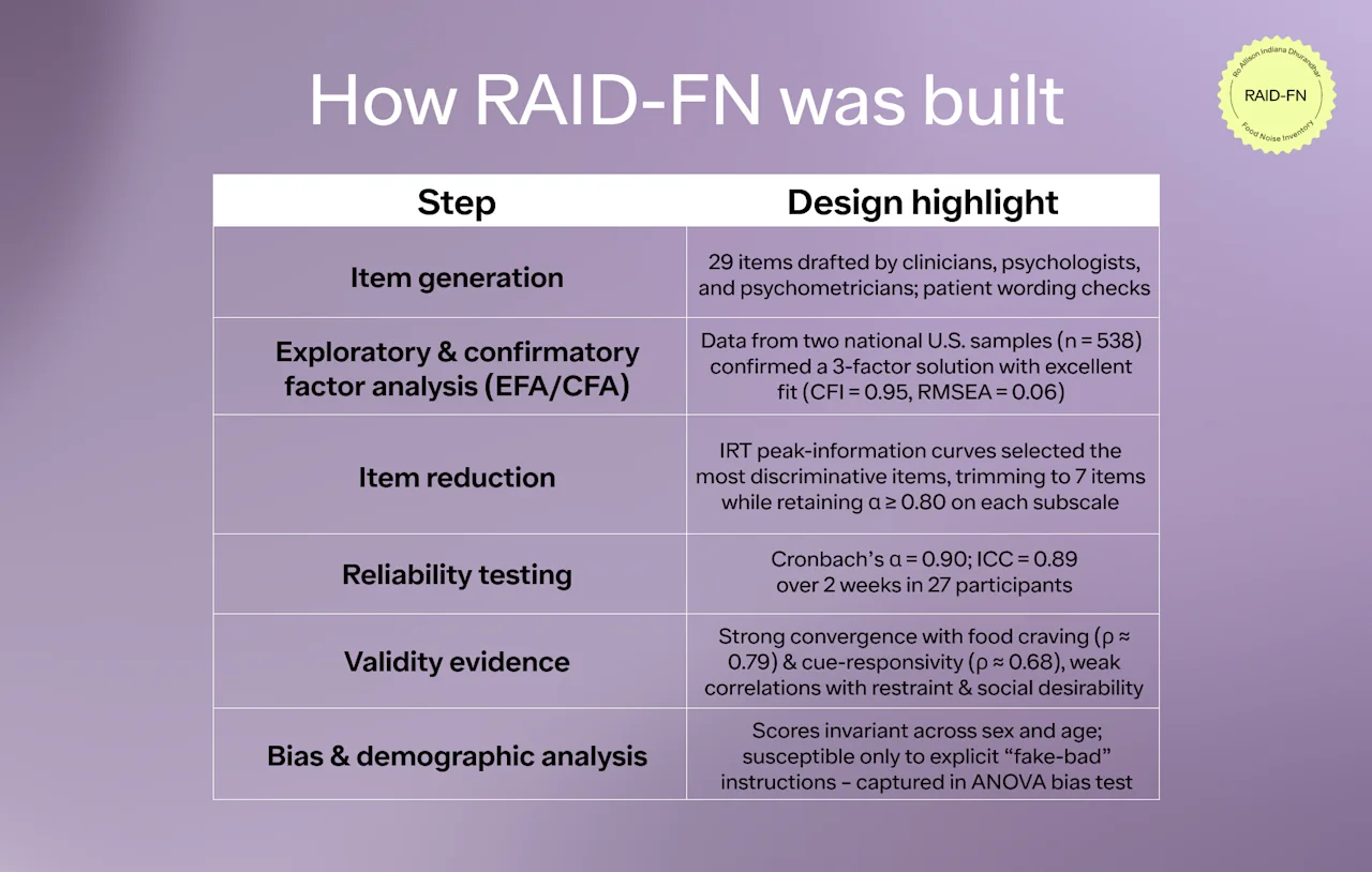 The Ro Allison Indiana Dhurandhar Food Noise Inventory (RAID-FN) was developed to fill that gap; the first psychometrically rigorous instrument designed to quantify food noise and distinguish it from overlapping constructs.