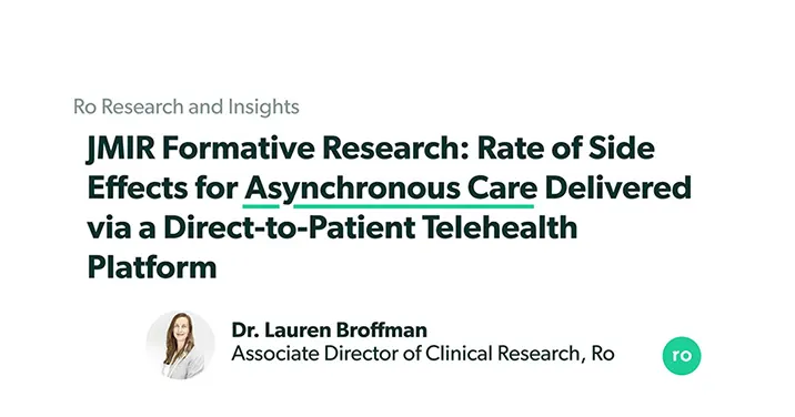To advance our collective understanding of outcomes associated with asynchronous care, Ro’s Research Team studied side effects reporting across the different modalities of treatment on our platform. This research was conducted by Melynda Barnes, MD, Chief Medical Officer, Kevin Stern, Senior Manager of Data, Amy Westergren, Director, Senior Regulatory Counsel, and me.