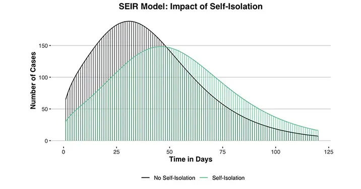 We wanted to roughly estimate how Covid-19 would spread in our hypothetical small town if the 35 infected-but-mild patients agreed to isolate versus if they were never advised to and thus did not self-initiate isolation. There are many modeling approaches that can be executed by highly-trained epidemiologists that can also account for variables like self-isolation in a sophisticated way. To be clear, this is not one of those models. It’s what’s known as a basic SEIR model (SEIR stands for susceptible, exposed, infected, and recovered), and the analysis was done by a PhD-level research scientist with a background in statistics but no formal training in epidemiology. In the interest of transparency, here’s how we did it (and you can review the full code here):